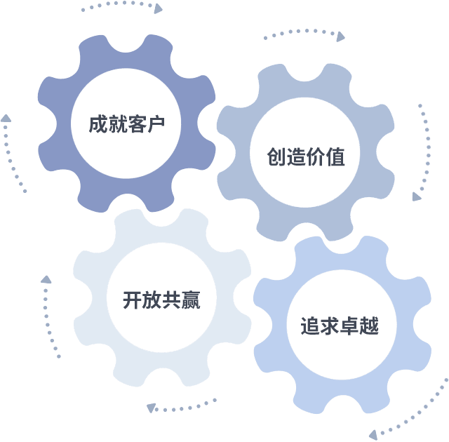 成就客户是一切决策的出发点,,,,创造价值是衡量所有工作的标准,,,追求卓越是PA尊龙时凯做事做人的态度,,,,开放共赢是PA尊龙时凯的格局也是最终的结果。。。。价值观的齿轮环环相扣,,推动着组织里的每个人不断向前。。